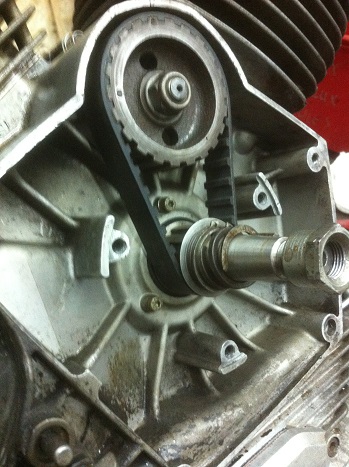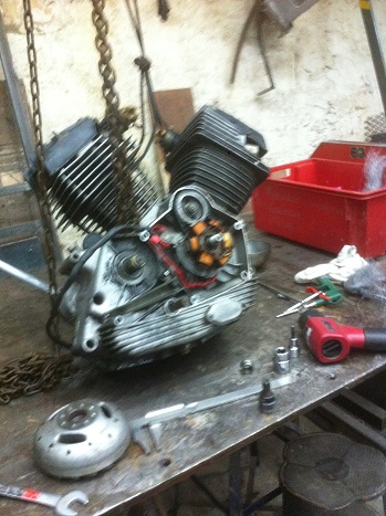 Le moteur est installé dans le cadre, j'a changer la courroie de distribution, réglé les culbuteur changer les cache culbu pour deux qui étaient plus beaux, monté le carter de transmission primaire qui permet le montage du démarreur, et là j'ai un nouveau défi à résoudre.