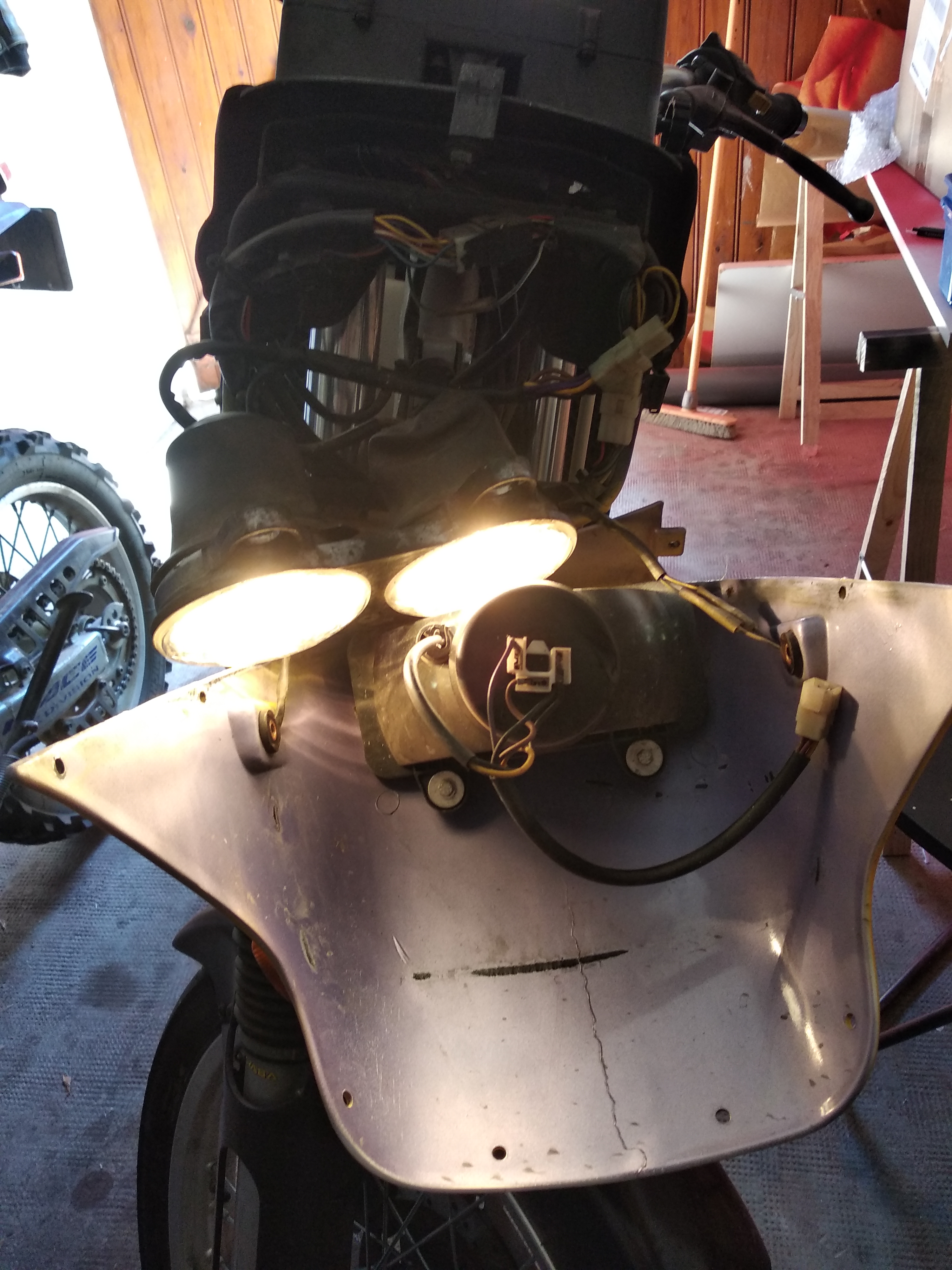 Alors le phare n'est absolument pas fixé au cadre ou autre. Il est juste fixé a la tête de fourche. Et l'ensemble est fixé par des vis passant par les clignotants. Pas robuste tout ça... Très bizarre comme ingénierie.