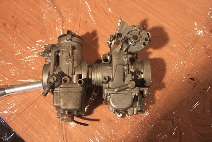Je n'avais pas trouvé ça intéressant avec le moteur standard 500 mais avec le bloc 556 on ne sais jamais ça peut être autre chose, ça ne me coûtera que du temps, j'ai tout, le carbu, la poignée double commande et les câbles. Pour ceux qui ne connaisse pas le Mikuni c'est celui de droite, même diamètre côté pipe et côté filtre en plus même longueur total, il rentre sans modification sur la moto il faut juste bricoler les butés des câbles de commande pour les orienter vers le haut, ce qui est déjà fait.