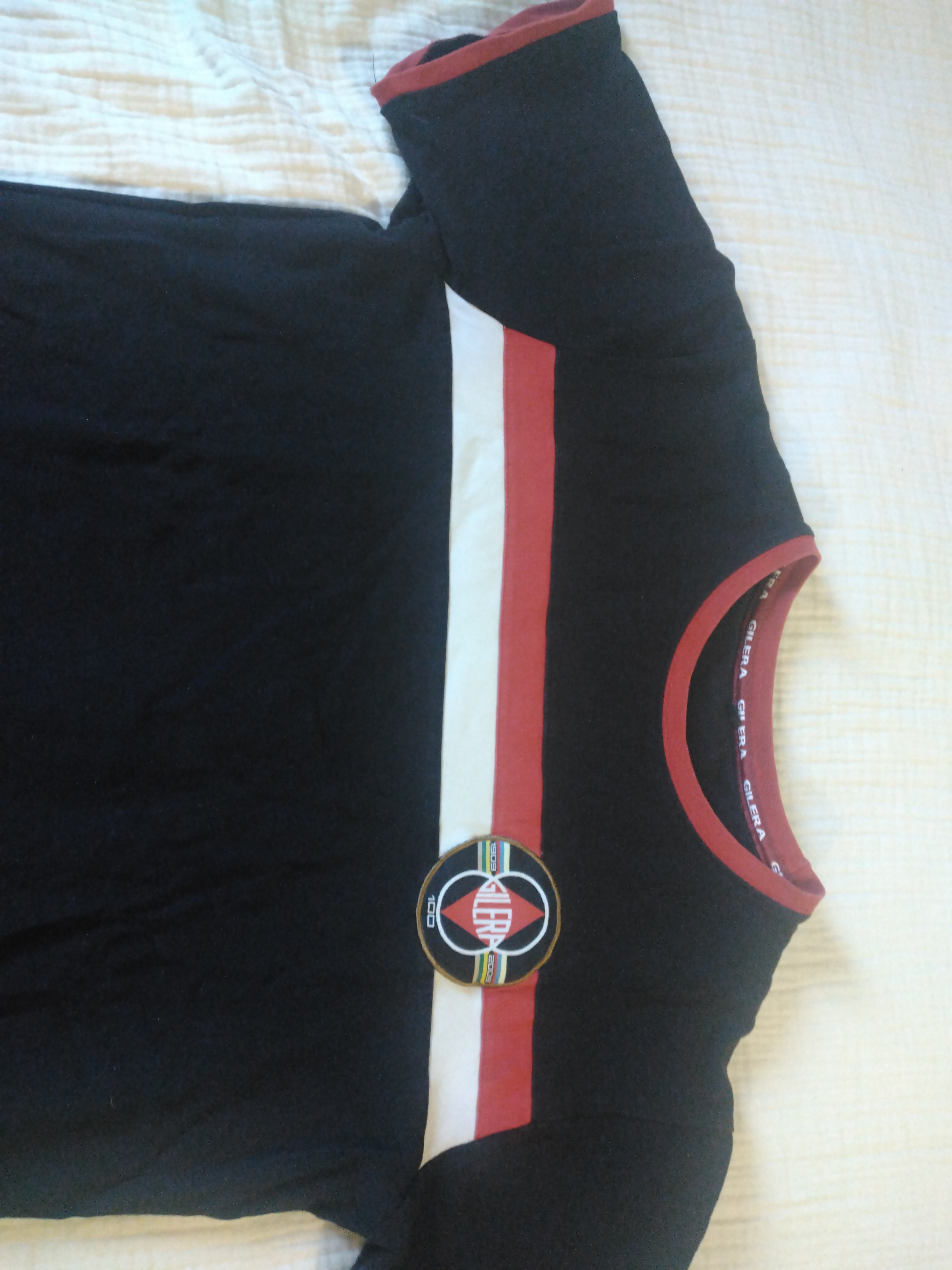J'ai imaginé que le double cercle pouait être devant en poitrine décalé d'un côté sur le cœur par exemple et Gilera en toute largeur au niveau des épaule dans le dos. Teeshirt rouge graphisme blanc, ce serai simple. après d'autre solution sont envisageable c'est comme vous voulez.