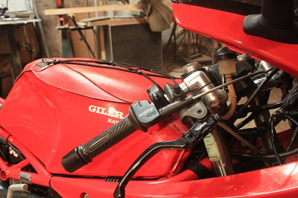 Au sujet des guidons, j'ai monté des Tomasselli en alu U4G, réglable dans toutes les directions, la difficulté comme dans tout changement de guidon c'est la fixation des masselotte en bout de guidon, comme ils sont tubulaire, j'ai fait tourner des bagues que j'ai rentré en force.