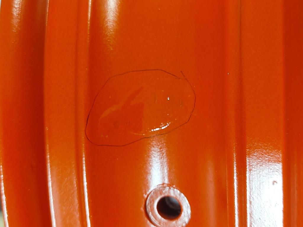 J'ai déglacé les zones à l'intérieur de la jante qui le méritaient, remis un voile de rouge dedans, un voile de vernis, un peu de colle époxy bicomposant localement sur les zones louches de la partie centrale hors contact avec le pneu mais qui montraient une ou des porosités de surface.