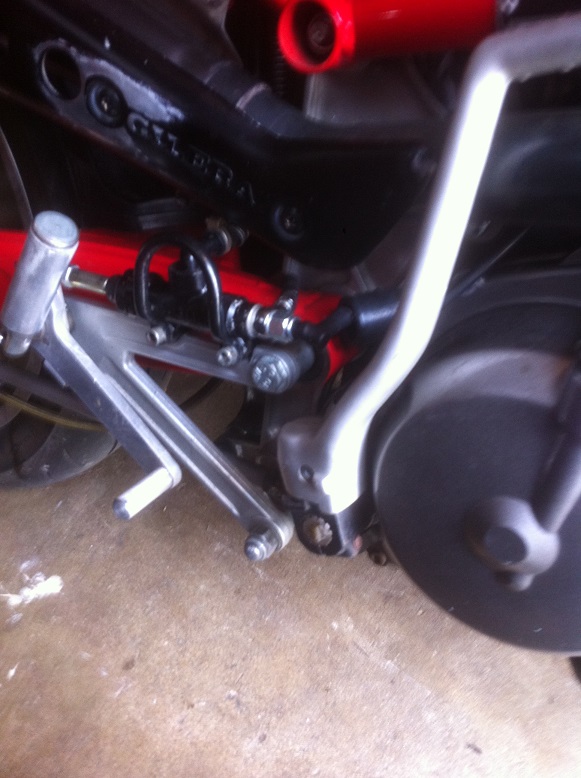 Ben oui l'erreur c'est que le raccord rigide éloigne la durite de la platine de repose pieds vers l'avant alors qu'elle devrait faire une courbe et contourner celle-ci, regarde bien les photos, la durite passe entre le kick et le carter, à l'origine ce n'est pas le cas, elle passe immédiatement sous le bras oscillant et rejoint la tringle de rappel.