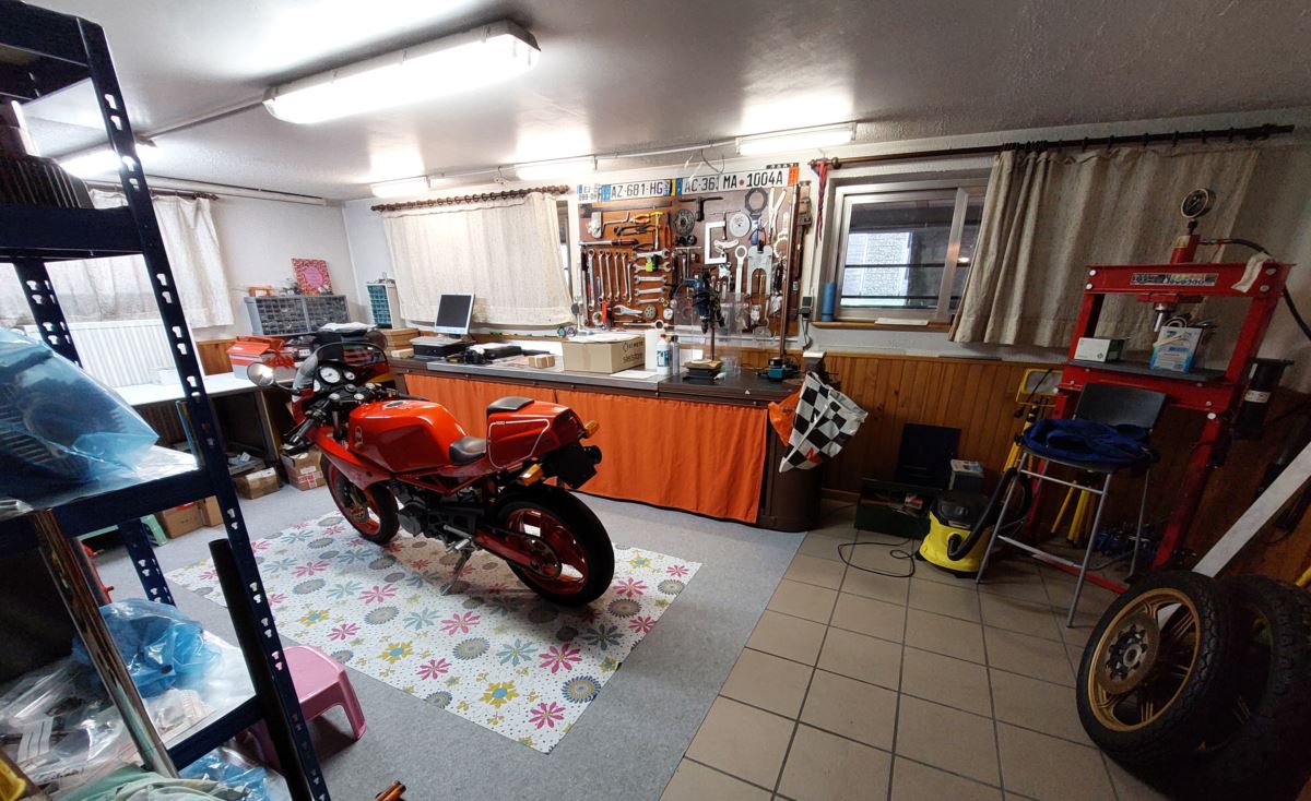 Je me suis fait aussi une béquille d'atelier avec des patins qui prend sur le bras oscillant au delà de la couronne, et pour l'avant je la lève avec un palan à chaine en fixant un anneau de levage sur la fixation centrale du réservoir,