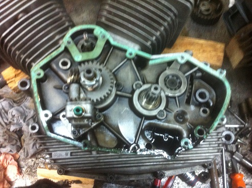 Le moteur sale (avec le joint vert j'imagine), ressemble à l'intérieur du carter de transmission primaire de ma NSU que j'ai démonté récemment et qui roule (peu) avec de la 20W50 qui est sûrement moins détergente que la 10W40.